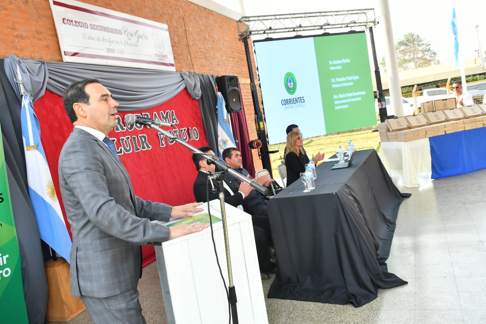 El rector del Colegio Secundario “Rosa Guarú” de Guviraví, Ramón Ponce, también dirigió unas palabras y agradeció la visita del Gobernador por la entrega de las notebooks, ya que los estudiantes “están recibiendo una de las herramientas necesarias para llevar adelante los procesos de aprendizaje, muy útil e indispensable en la actualidad”. Además, “no solamente agradecer por esta herramienta tecnológica, sino también por el servicio de internet que colocaron en nuestra institución para aportar a que nuestras clases sean más eficientes, sumado a la refacción de todo el establecimiento escolar”, comentó.