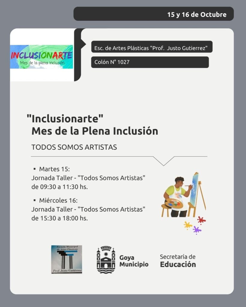 En el marco de las actividades programadas en el Mes de la Plena Inclusión, la Secretaría de Educación propone junto a la Escuela Municipal de Artes Plásticas “Profesor Justo Gutiérrez” dos jornadas de expresión creativa.