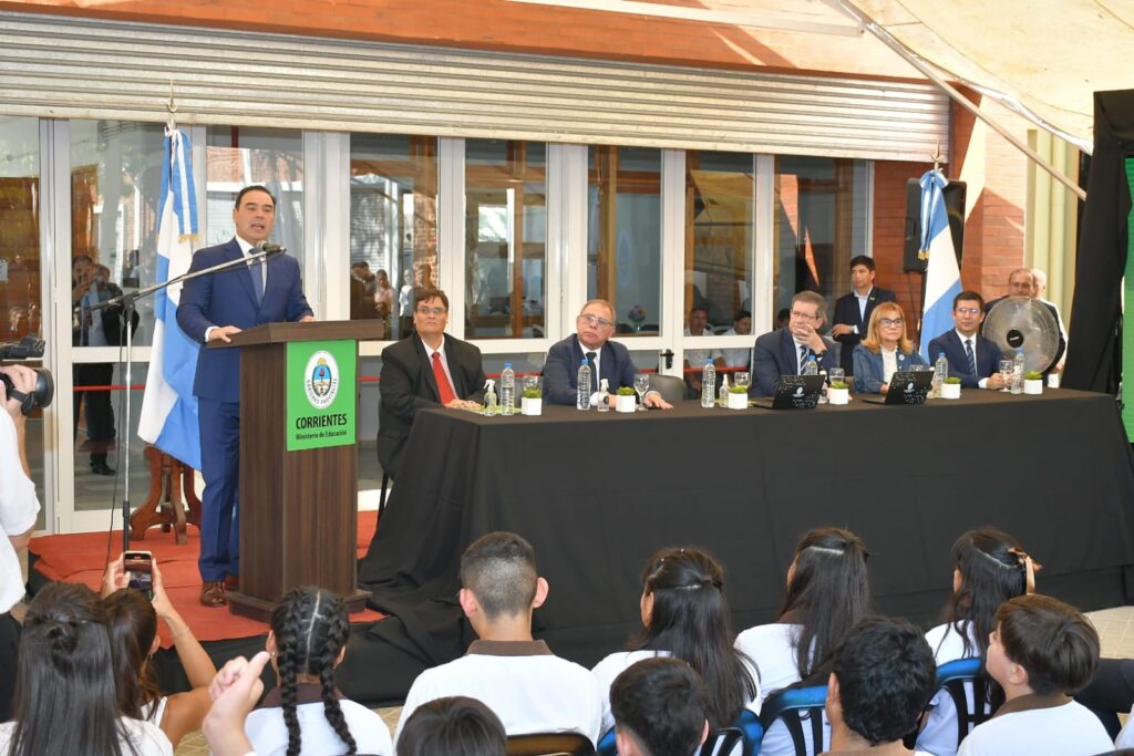 Reafirmando su compromiso con la educación pública, el gobernador Gustavo Valdés dio inicio al ciclo lectivo 2025, en un acto desarrollado este miércoles por la mañana en la Escuela Técnica de Construcciones Portuarias y Vías Navegables en Capital, ocasión en la que, con el tradicional corte de cintas, inauguró la etapa final de obras de dicho establecimiento que quedó a nuevo, las que se pudieron culminar gracias a una fuerte inversión de la Provincia. Además, en el marco del programa “Incluir Futuro”, el Gobierno Provincial entregó durante el acto 582 notebooks, distribuidas a alumnos del nivel secundario tanto de la escuela anfitriona como a otras del ámbito capitalino.