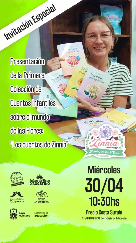 El próximo martes 29 de abril a las 15 hs en el predio Costa Surubí, en el Stand Institucional, la Secretaría de Educación presenta a la florista Sandra Aguirre, reconocida en nuestra región por su amor y dedicación al mundo natural, quien oficialmente pondrá a consideración su primera colección de cuentos infantiles: “Los Cuentos de Zinnia”.