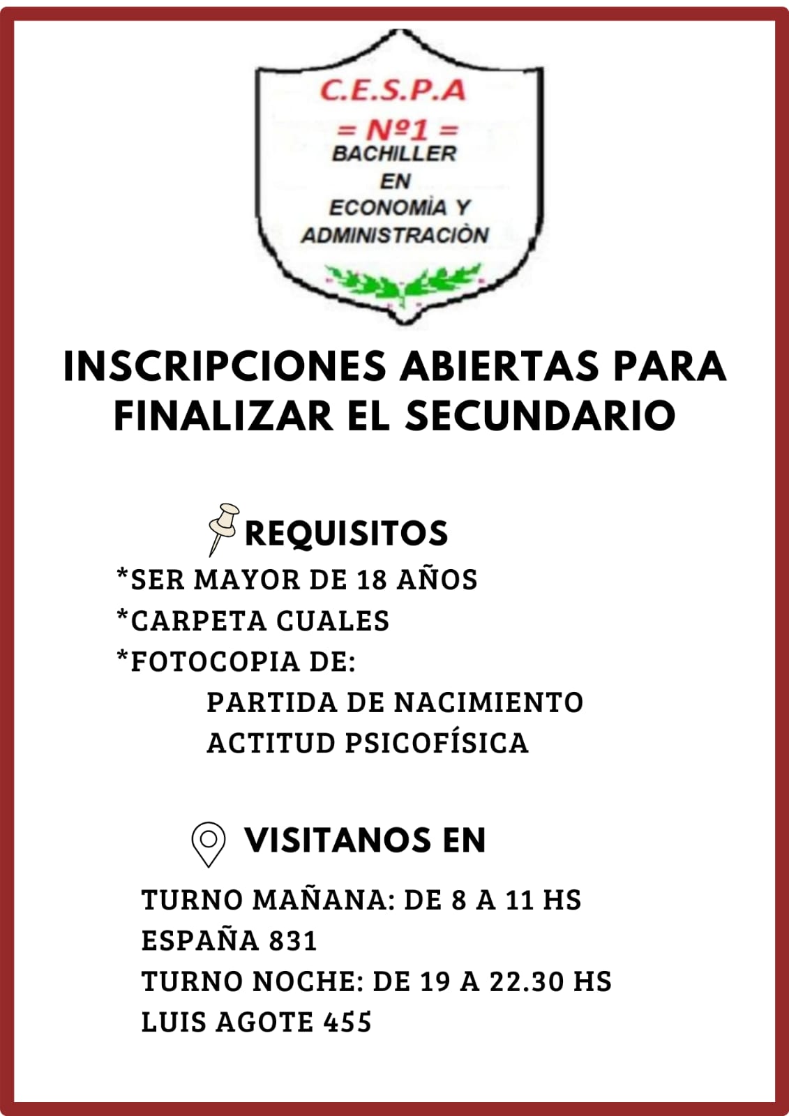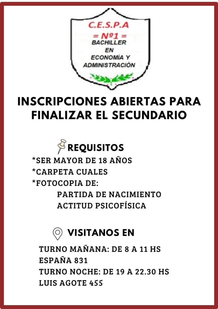 “Los interesados en cursar este bachiller pueden dirigirse por la mañana a calle España 831 de 7,45 a 11,30 horas, por la tarde noche en calle Luis Agote 455 en el horario de 19 a 22,30”, reiteró.