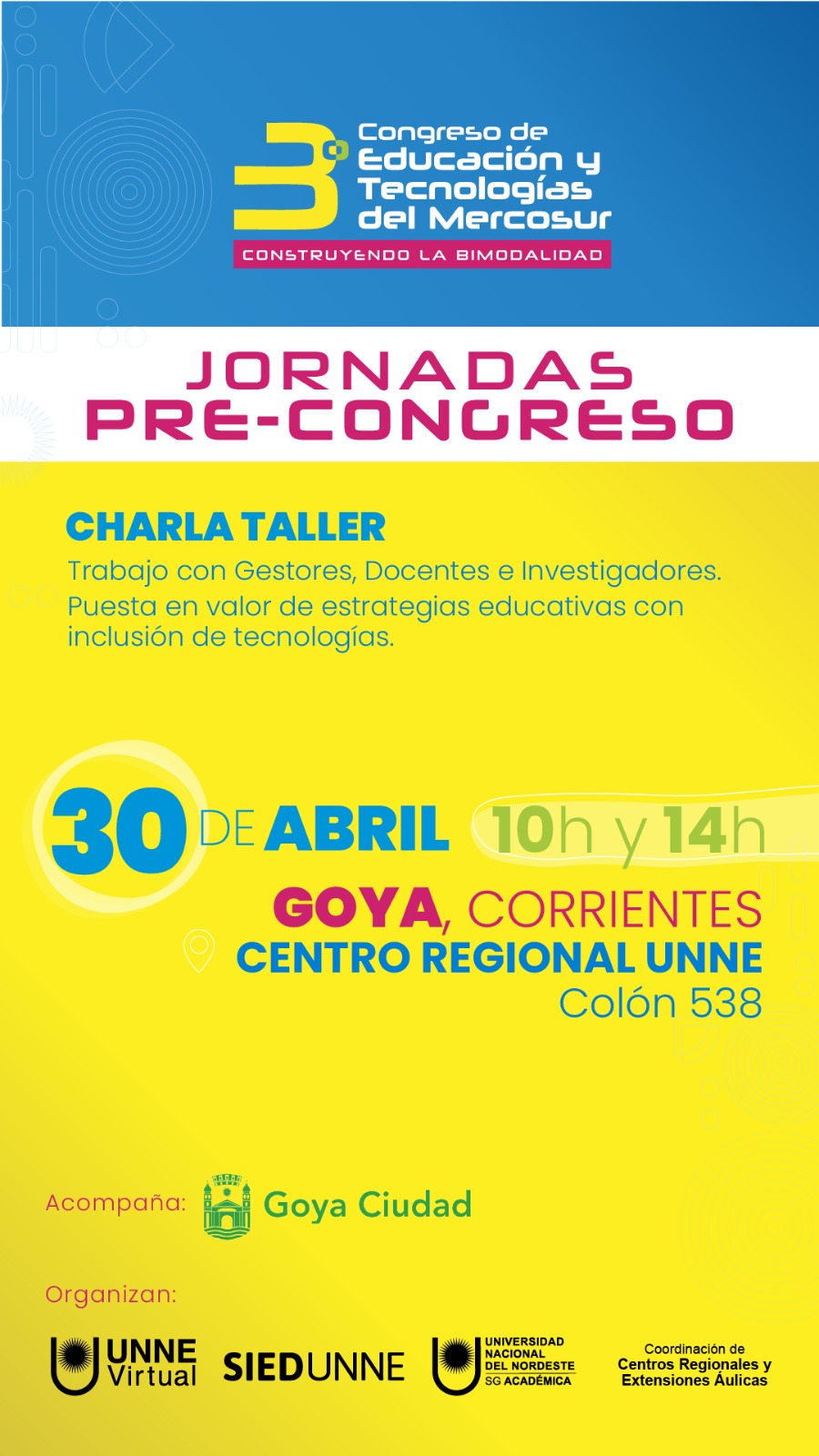 En el marco de la tercera edición del Congreso de Educación y Tecnologías del Mercosur – Construyendo la Bimodalidad, el miércoles 30 de abril se realizarán en Goya las Jornadas Pre-Congreso, orientadas a docentes, gestores e investigadores.