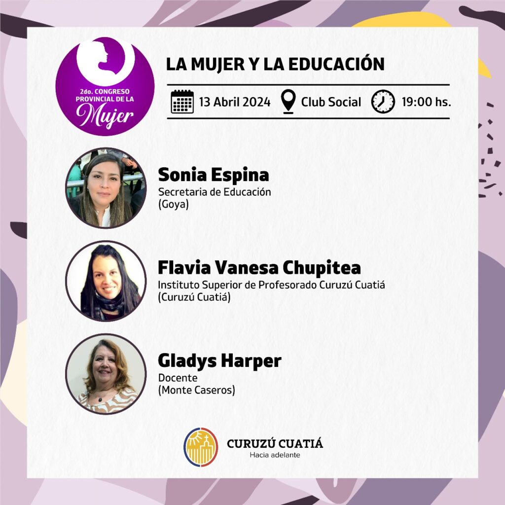 Sonia Espina valoró: “Más allá del aporte que podemos brindar, seguramente nos enriquecerá todo lo que estaremos recibiendo durante este Congreso, donde estarán representadas las mujeres en todos los sectores. Uno se siente feliz y asume el desafío, por el reconocimiento a la Municipalidad, y el hecho de ser parte del panel con excelentes profesionales del ámbito académico de Curuzú Cuatiá y Monte Caseros”.