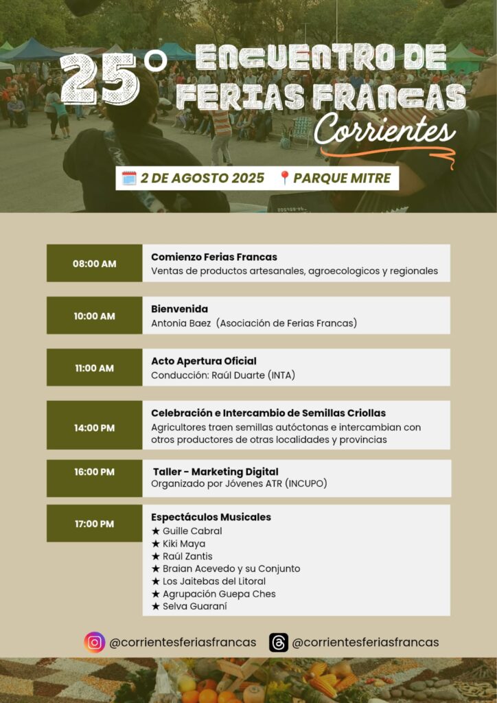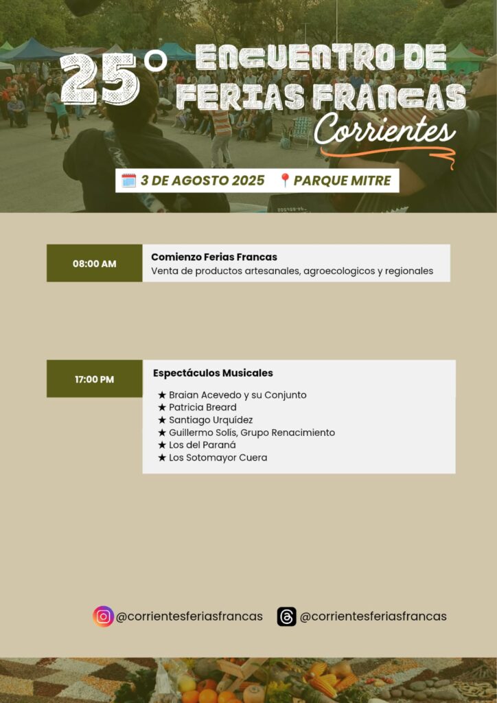 Desde todas las localidades de Corrientes y también desde las provincias de Misiones, Chaco,?Formosa, Santa Fe y Buenos Aires, los feriantes llegarán para instalarse en el parque Mitre durante el próximo fin de semana para realizar el 25.º Encuentro Provincial de Ferias Francas. “Nos preparamos con más fuerza para recibirte con sabores locales, artesanías y la calidez de nuestras familias feriantes”, anunciaron desde la organización, luego de haber pospuesto la fecha de la realización del evento – prevista para el fin de semana pasado – ante las condiciones climáticas que amenazaron con aguar el encuentro.