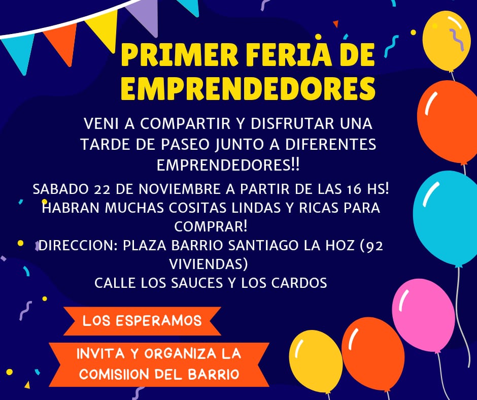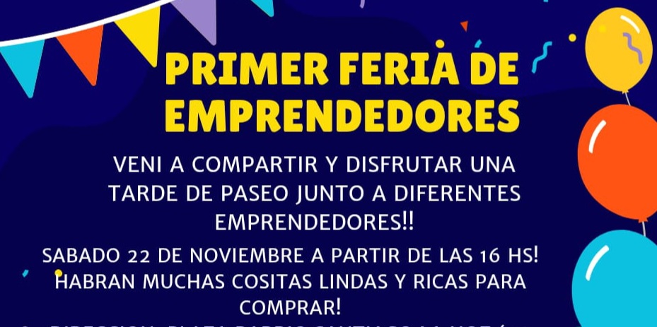 Este sábado 22 de noviembre, a partir de las 16 horas, vecinos y visitantes podrán disfrutar de una tarde especial en la Primera Feria de Emprendedores, un evento pensado para compartir, recorrer y apoyar a quienes impulsan sus proyectos locales.