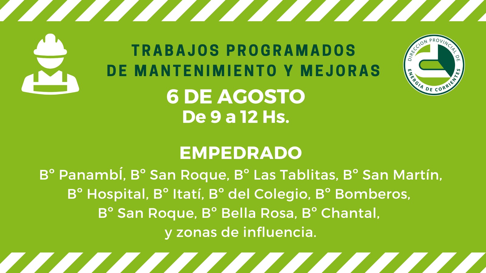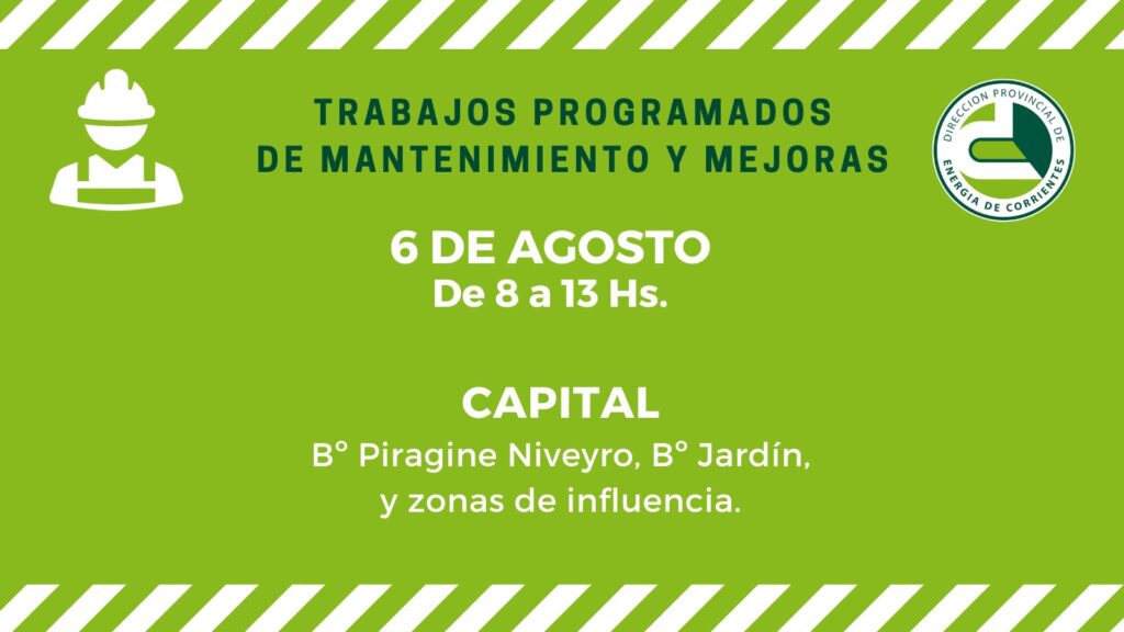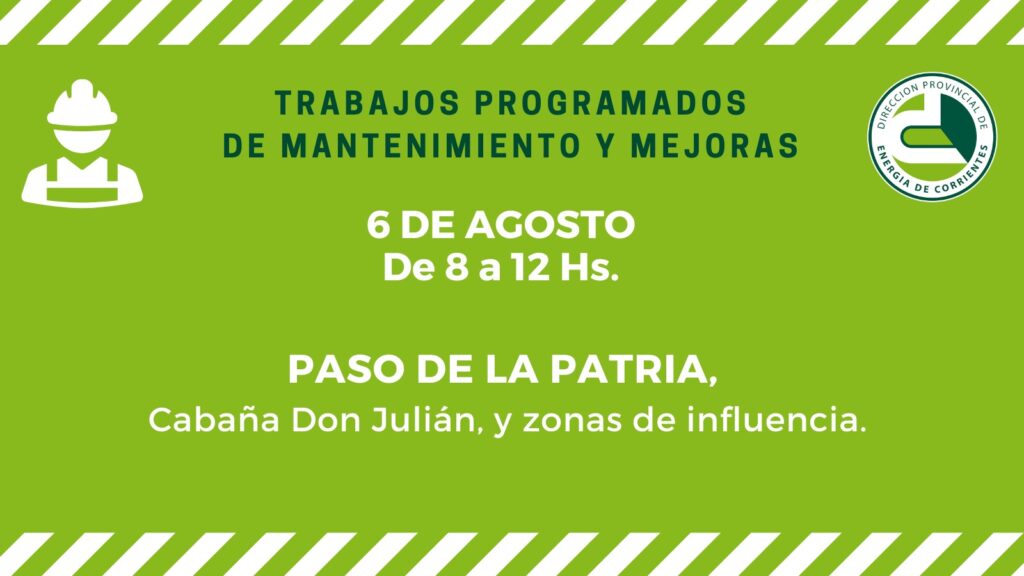 En Empedrado, se ejecutarán tareas de mantenimiento de Líneas de Media Tensión, este miércoles 06 de 09 a 12, en los barrios Panambí, San Roque, San Martín, Las Tablitas, Hospital, Itatí, del Colegio, Bomberos, Bella Rosa, y Chantal.