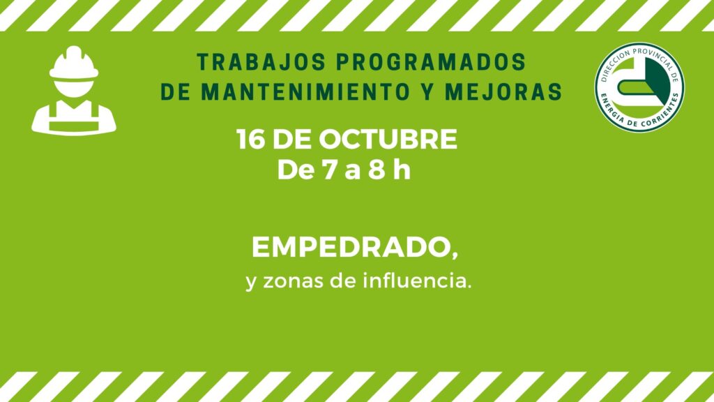 La Dirección Provincial de Energía de Corrientes (DPEC) informa que con motivo de realizar mejoras en el servicio, por lo cual se interrumpirá el suministro de energía eléctrica en la localidad de Sauce, San Cosme, Mercedes, Empedrado, y en Capital, este jueves 16 de octubre.