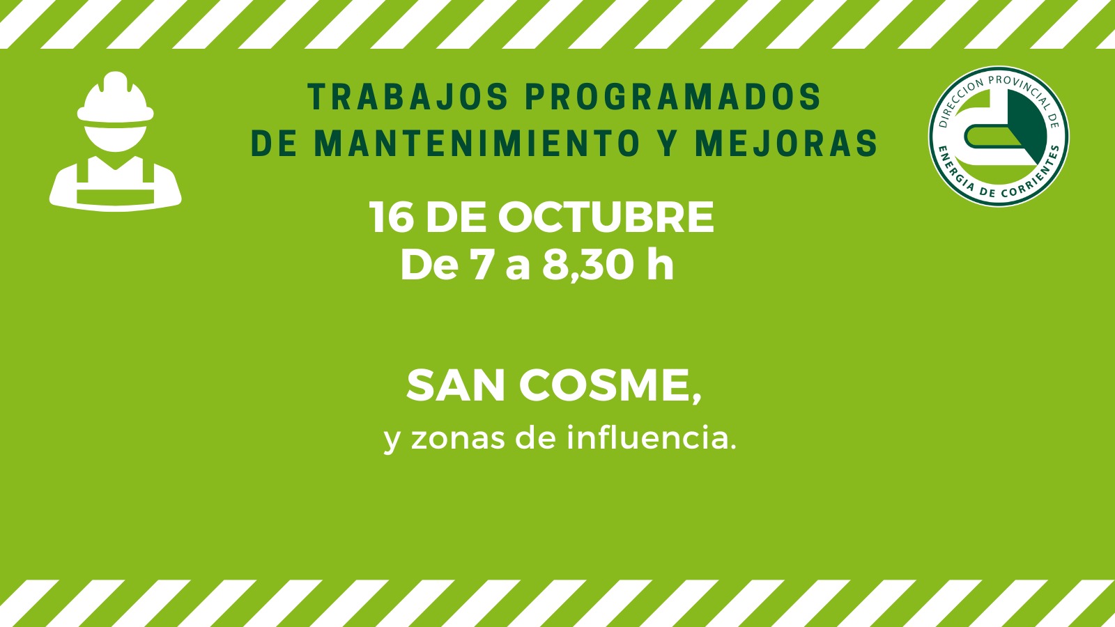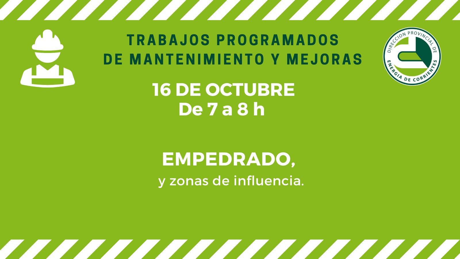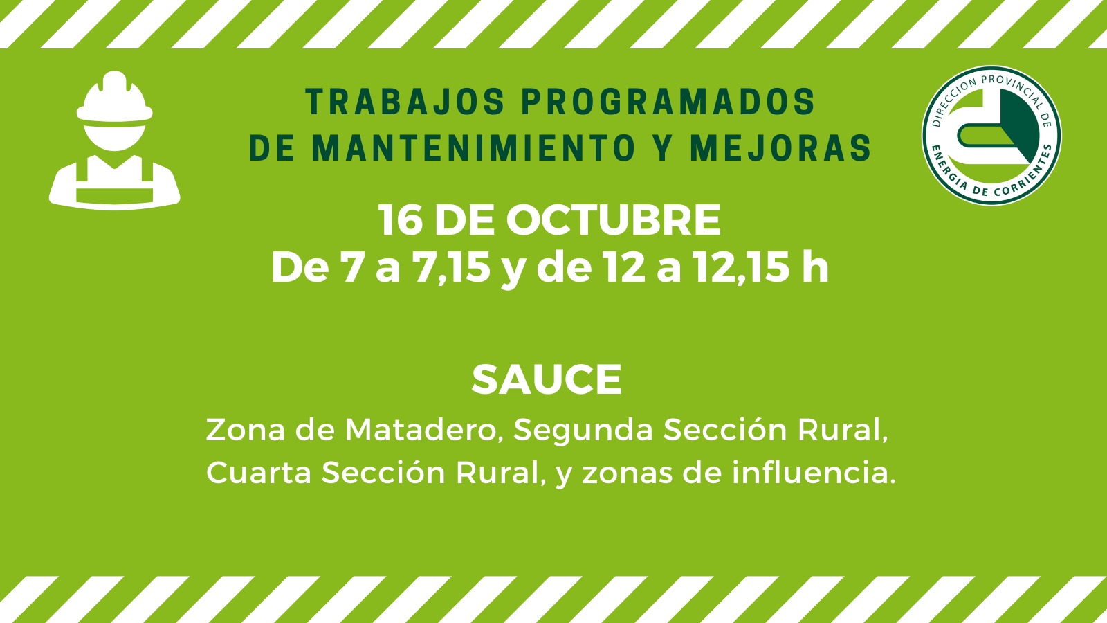 La Dirección Provincial de Energía de Corrientes (DPEC) informa que con motivo de realizar mejoras en el servicio, por lo cual se interrumpirá el suministro de energía eléctrica en la localidad de Sauce, San Cosme, Mercedes, Empedrado, y en Capital, este jueves 16 de octubre.