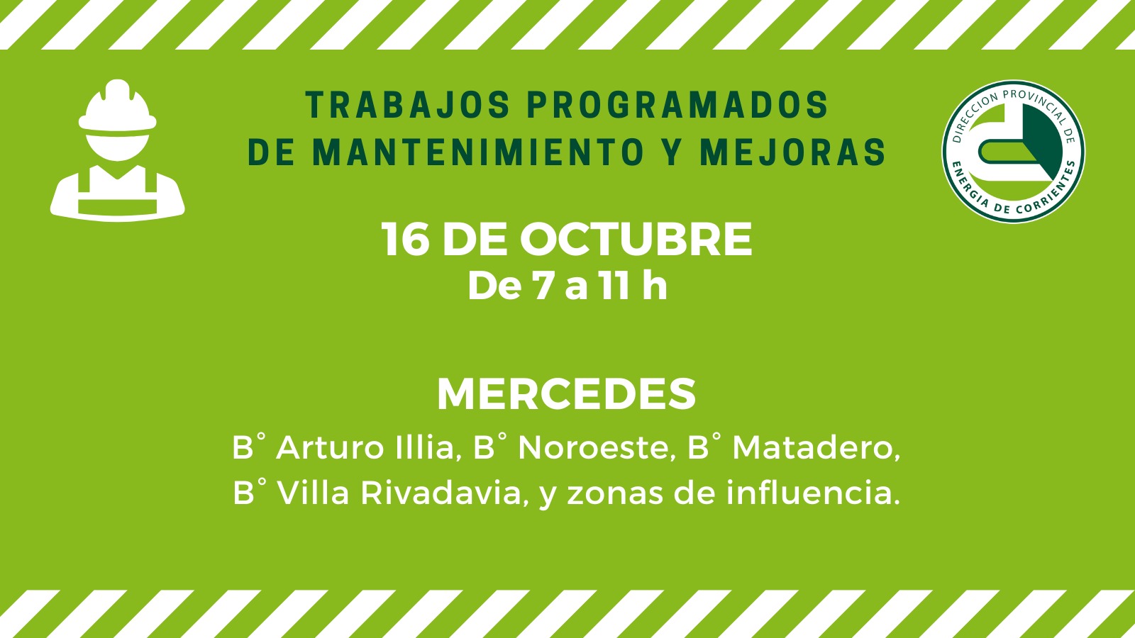 También, por mantenimiento de Líneas de Baja Tensión, se interrumpirá el suministro de energía en Mercedes, este jueves 16 de 07:00 a 11:00 en los barrios Arturo Illia, Noroeste, Matadero, y Villa Rivadavia.