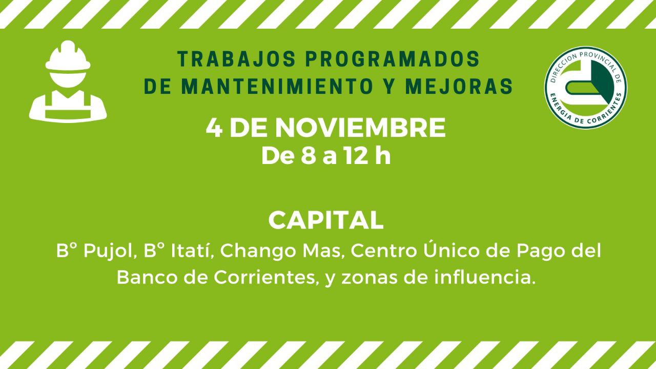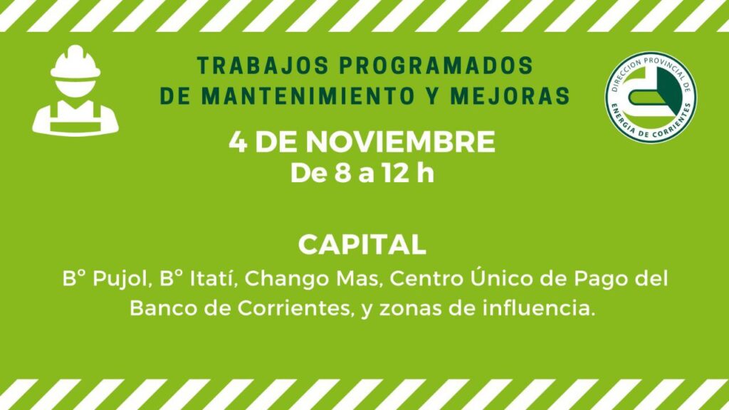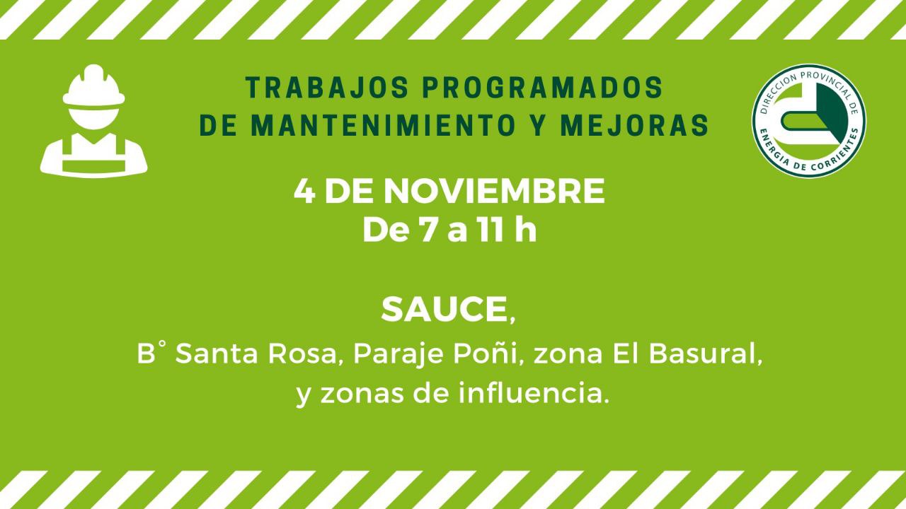 La Dirección Provincial de Energía de Corrientes (DPEC) informa que con motivo de realizar mejoras en el servicio, este martes se llavarán adelante trabajos de mejoras en Sauce, Carlos Pellegrini, Goya y Capital.