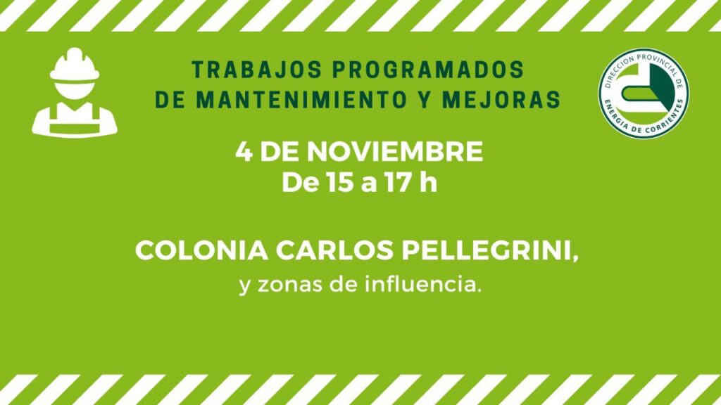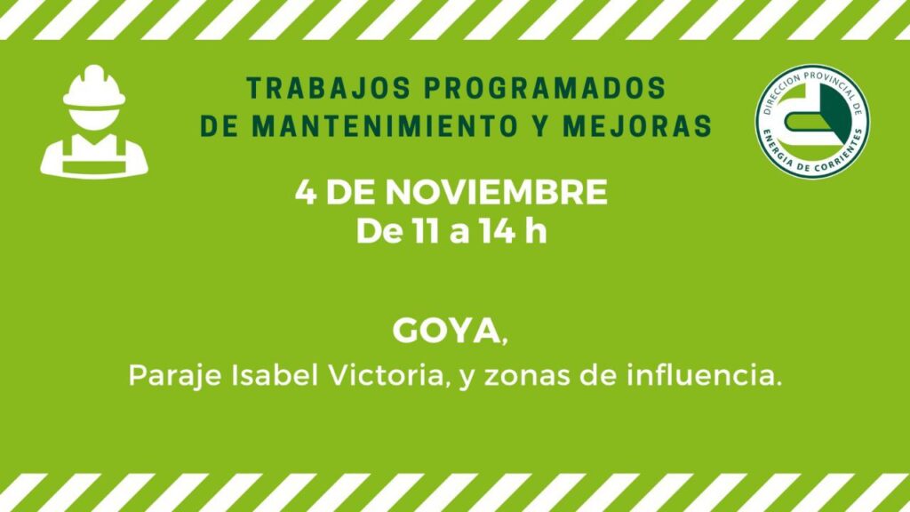 La DPEC informa también que se concretarán acciones de colocación de postes en Carlos Pellegrini y proximidades, por lo cual la luz se verá interrumpida de 15 a 17 horas. Asimismo en Goya se llevarán a cabo trabajos de mantenimiento de Líneas de Media Tensión (LMT), lo que provocará la interrupción del suministro de energía eléctrica en Paraje Isabel Victoria y zonas de inlfuencia, en el horario de 11 a 14.