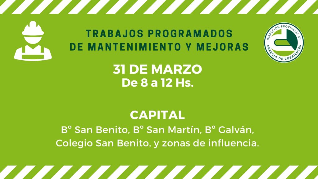 Por otra parte, para llevar adelante tareas de mantenimiento de Líneas de Media Tensión (LMT), este lunes se suspenderá la provisón de energía eléctrica en la ciudad de Corrientes, en la zona comprendida por los barrios San Benito, Colegio «San Benito», barrios San Martín y Galván, y alrededores. Está previsto que sea en el horario de 8 a 12.