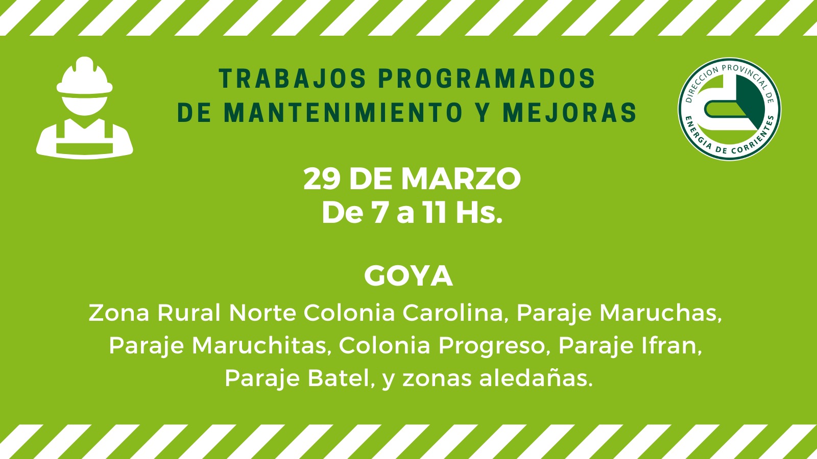 En primer lugar, para ejecutar tareas de construcción de Subestación Transformadora Aérea, este sábado se cortará el servicio en Goya, de 7 a 11 horas. Afectará específicamente a Colonia Carolina, Colonia Progreso, y parajes Maruchas, Maruchitas, Ifrán, Batel y áreas de influencia.