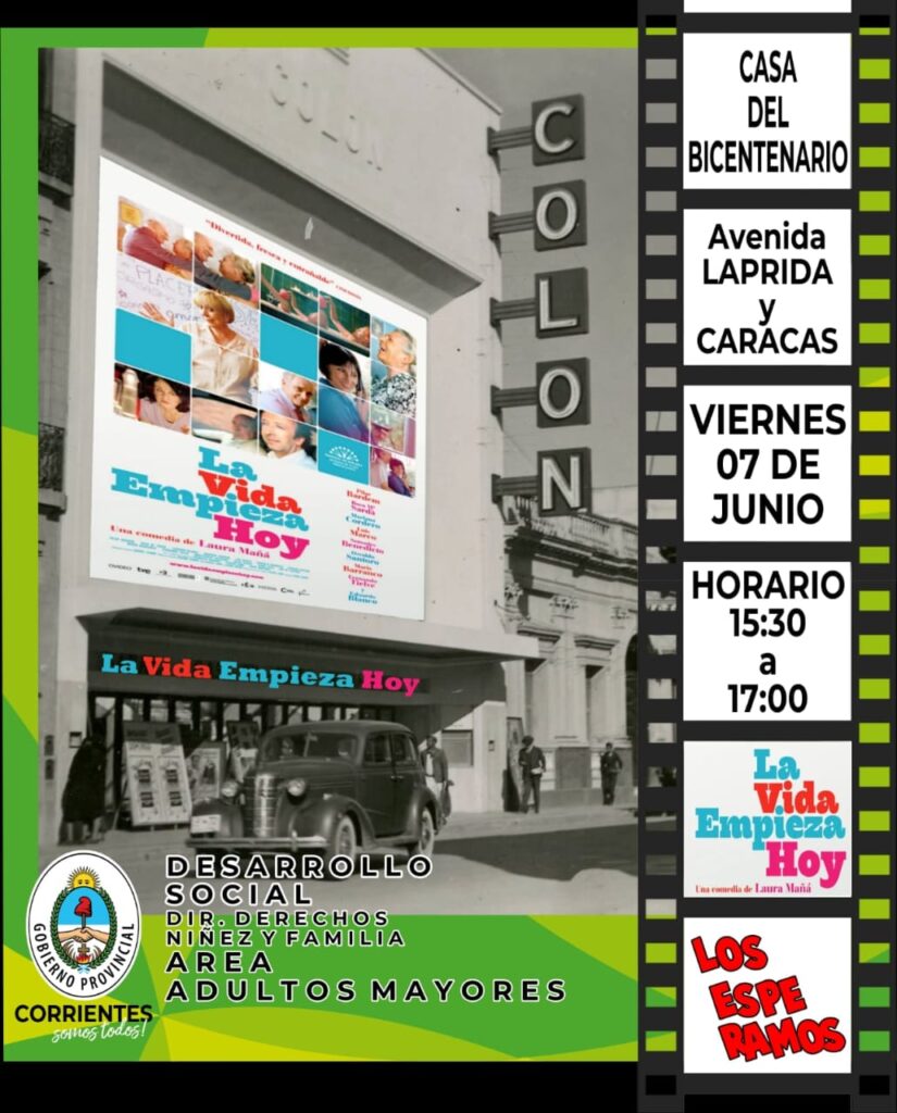 El Ministerio de Desarrollo Social de la provincia inicia un ciclo de cine para adultos mayores desde este viernes, de 15 a 17, en la Casa Del Bicentenario, ubicada en la Plaza de la Tradición del Barrio San Gerónimo de la ciudad de Corrientes.
