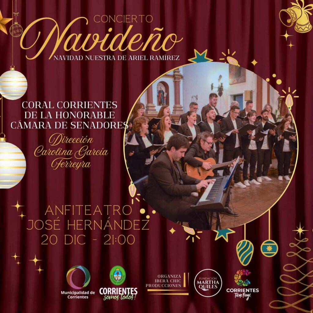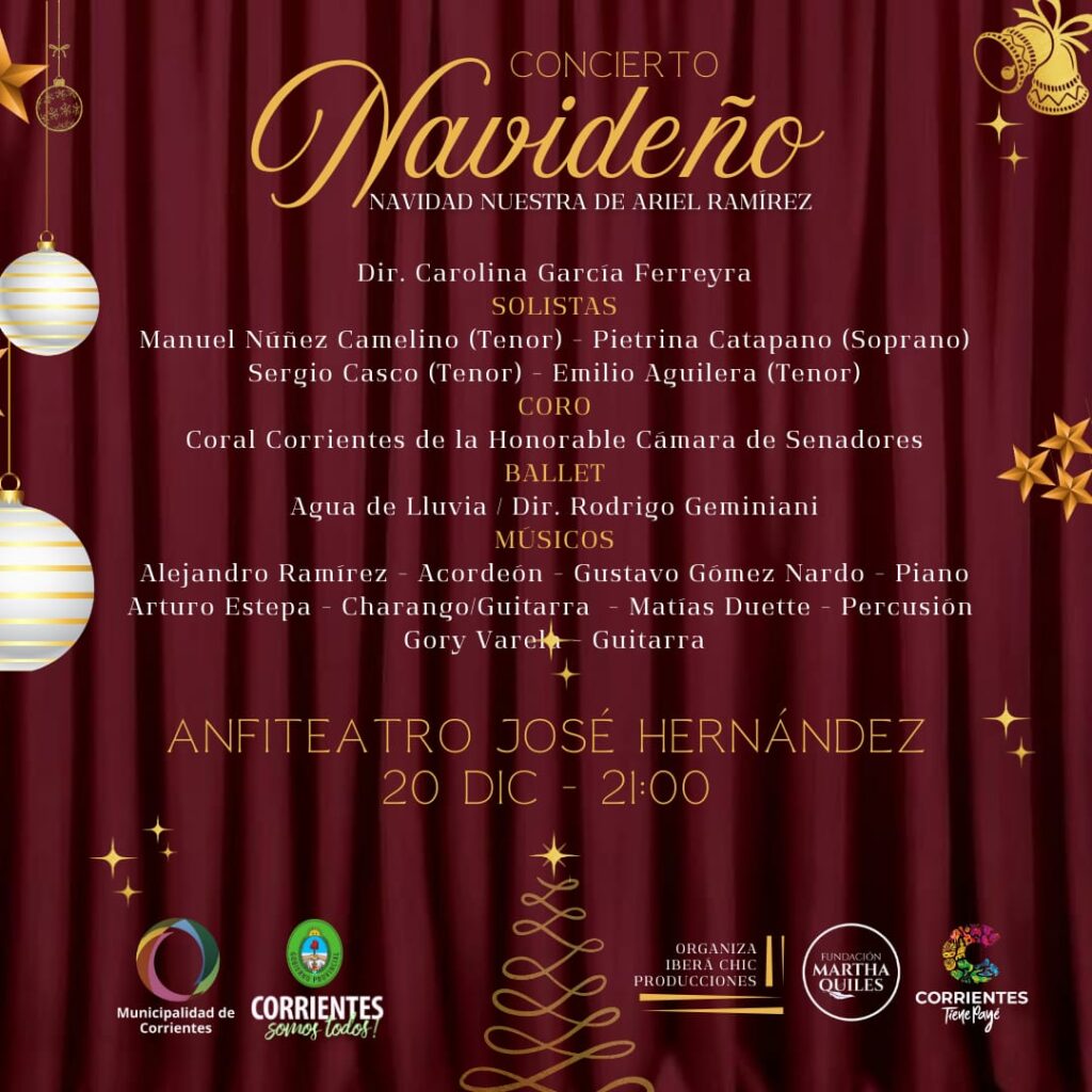 Con el apoyo del Gobierno de la Provincia y la Municipalidad de la ciudad de Corrientes, a través de la Secretaría de Cultura y Educación, se presentará el concierto navideño denominado la “Navidad Nuestra” de Ariel Ramírez. El evento tendrá lugar el viernes 20 en el Anfiteatro José Hernández a las 21, con entrada gratuita. Será interpretado por los referentes más destacados del género artístico lírico de la Provincia de Corrientes.