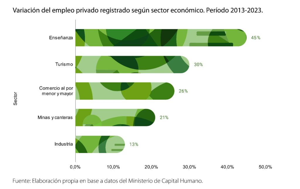 En cuanto a los sectores económicos de la provincia, los que registraron un mayor crecimiento del empleo privado registrado fueron: el industrial con 13%; minas y canteras con 21%; comercio al por menor y por mayor con 26%; turismo con 30% y enseñanza con 45%.