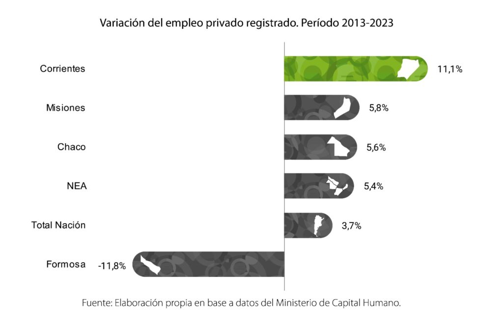 La provincia de Corrientes pasó de tener 71.674 asalariados registrados privados en 2013 a 79.652 en 2023, lo que representó una variación de 11,1%, superior al promedio nacional de 3,7% y de la región del NEA de 5,4%.