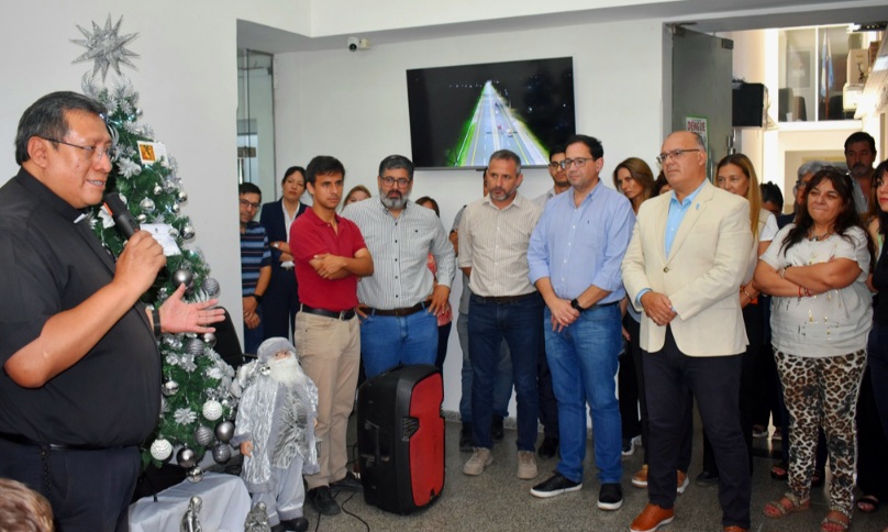Con los acordes de tradicionales villancicos navideños, interpretados por el conjunto del Seminario Arquidiocesano Redemptoris Mater de Corrientes, que dirige el padre Eli Alfano, se vivió esta mañana un emotivo momento en el Ministerio de Obras y Servicios Públicos (MOSP), en el marco de la bendición del Pesebre de Navidad y ante la proximidad del nacimiento del Niño Jesús.