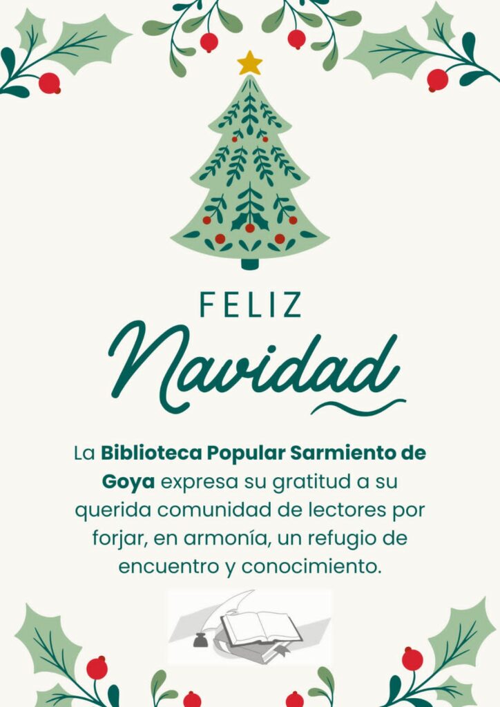 La Comisión Directiva de la Biblioteca “Sarmiento” señala: ¡Feliz Navidad! La Biblioteca Popular Sarmiento de Goya expresa su gratitud a su querida comunidad de lectores por forjar, en armonía, un refugio de encuentro y conocimiento.