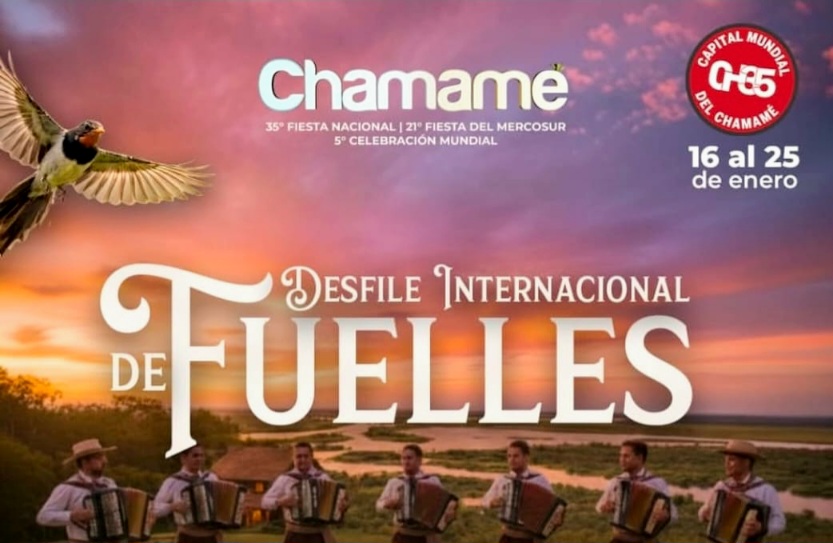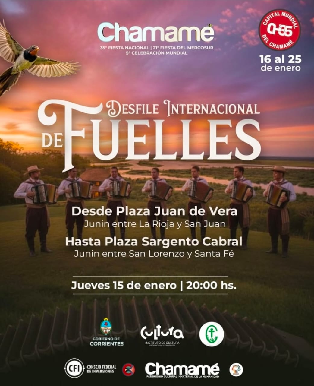 En el marco de la 35ª Fiesta Nacional del Chamamé, este jueves 15 de enero, las calles de Corrientes se transforman en un escenario vivo con el gran Desfile Internacional de Fuelles que partirá desde Plaza Vera hacia la Plaza Cabral a las 20.