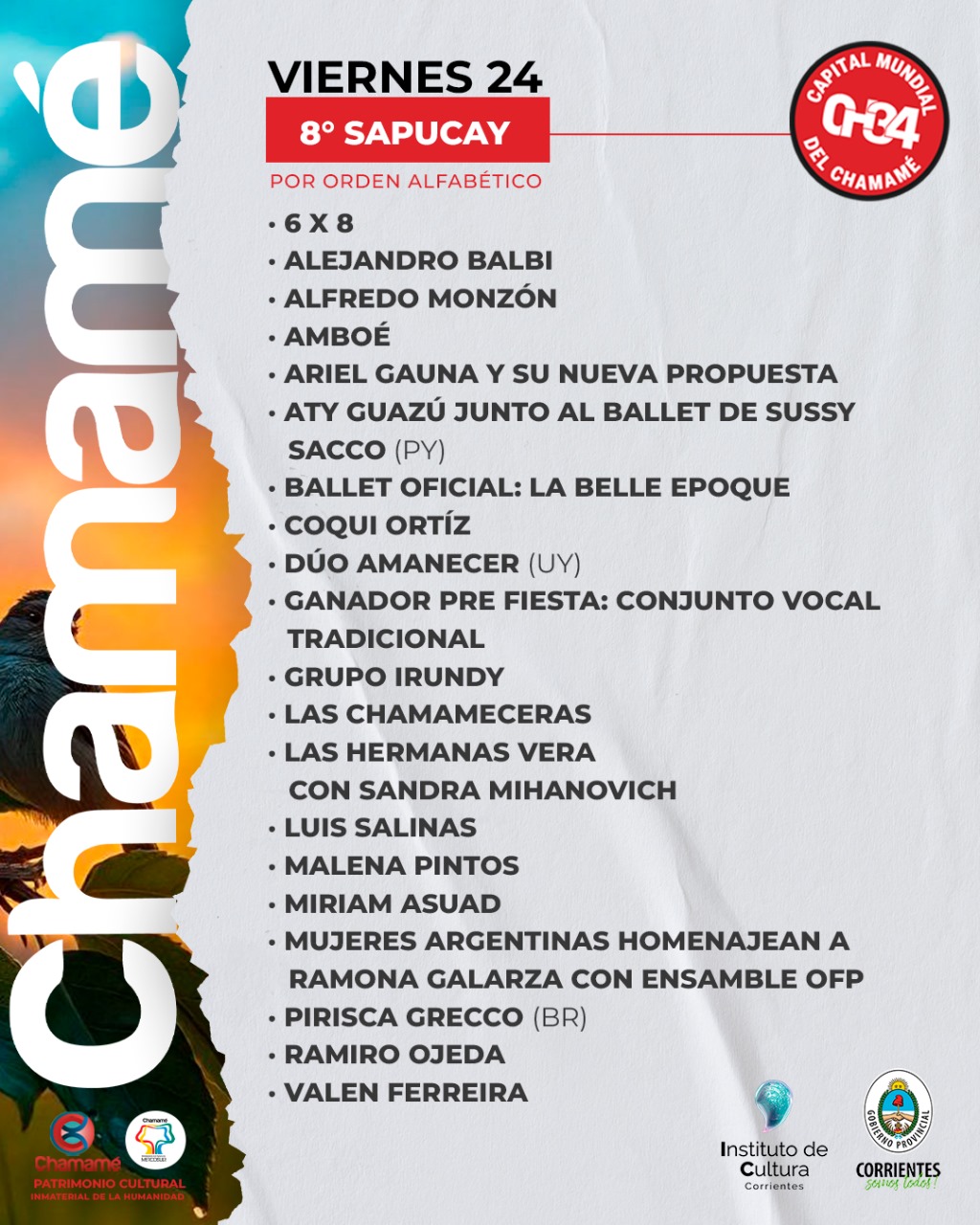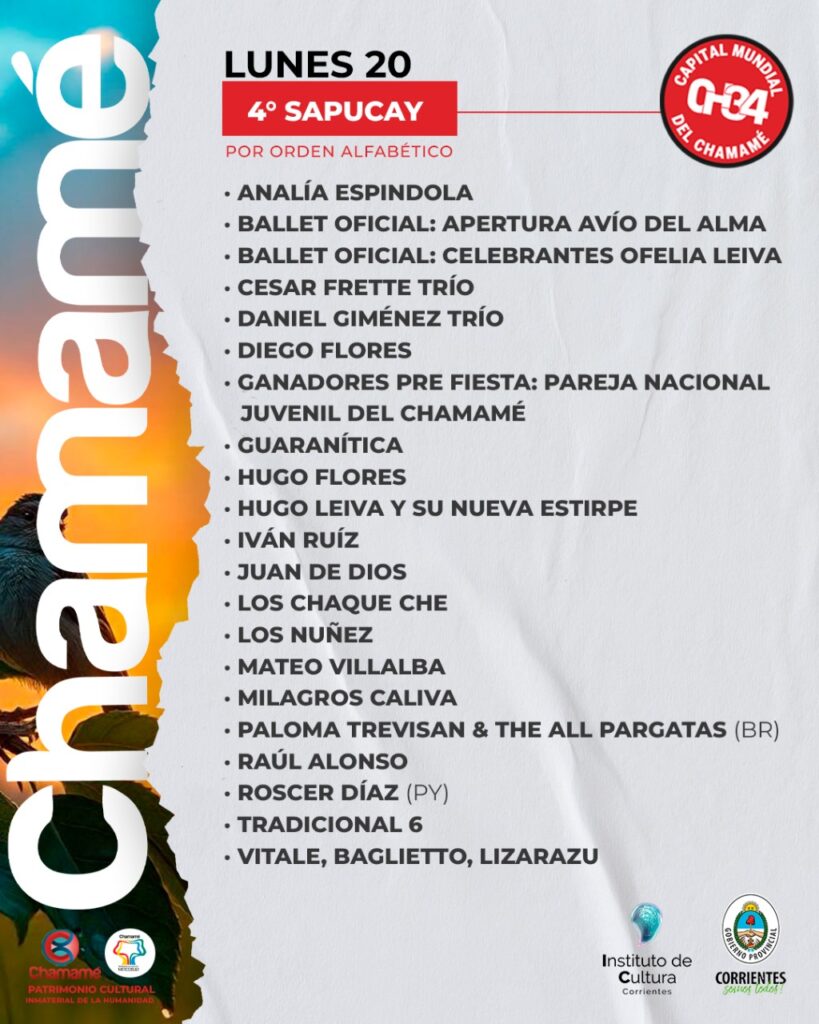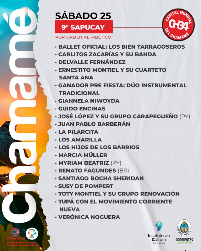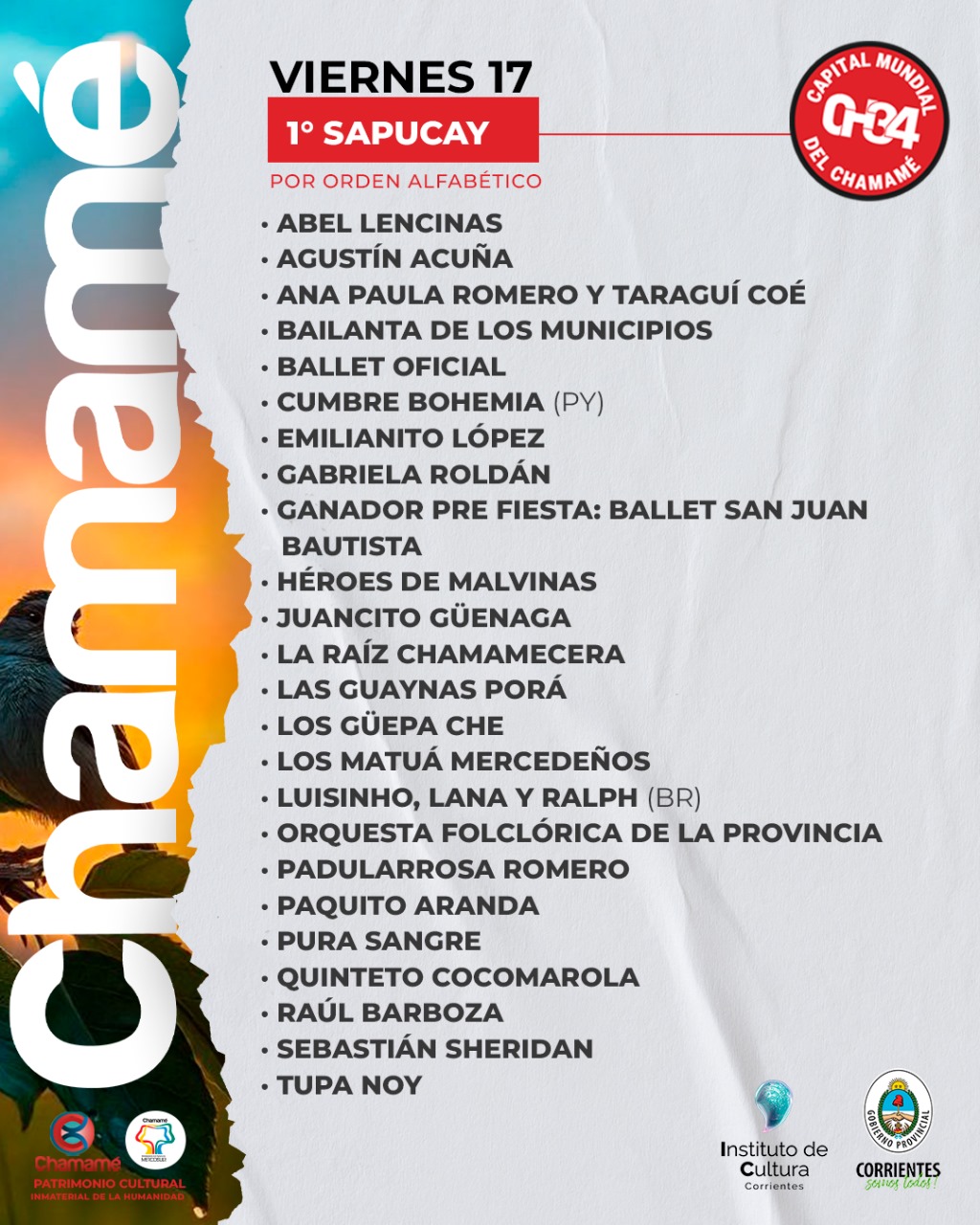 Además, en esta edición «Chamamé, avío del alma», a los máximos referentes del Chamamé se sumarán artistas de los vecinos países del Paraguay, Brasil y Uruguay, que integran la gran Nación Chamamé, celebrando la identidad que une a toda esta región del continente. De igual manera tendrán fuerte representación los músicos chaqueños, formoseños, misioneros y entrerrianos.