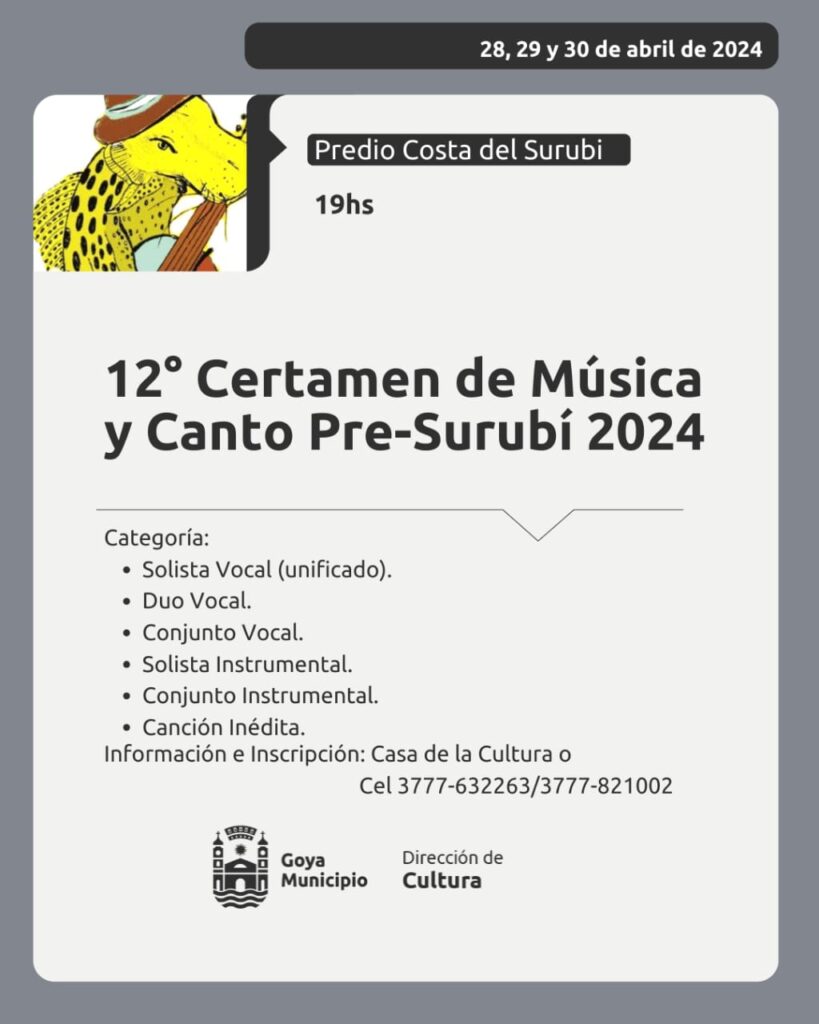 En la Casa de la Cultura se inscribe para participar del 12º Certamen de Música y Canto Pre Surubí. Los participantes concursarán en las siguientes categorías: Solista Vocal (unificado); Dúo Vocal; Conjunto Vocal; Solista Instrumental; Conjunto Instrumental; Canción Inédita. Para más información, los interesados pueden concurrir a la misma Casa de la Cultura o al celular 3777632263 o al 3777821002.
