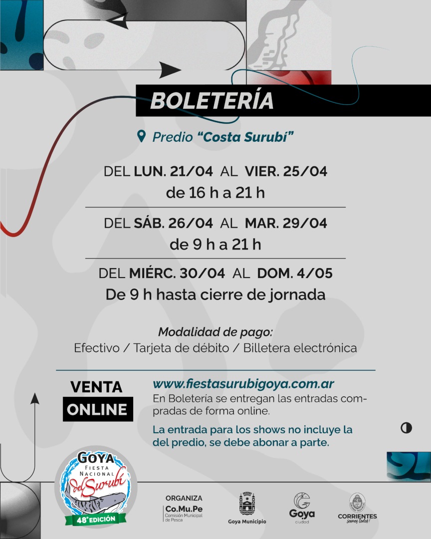 Desde la Comisión Municipal de Pesca queremos asegurarnos de que todos puedan disfrutar del evento sin inconvenientes, por eso desde el área de Tesorería y boleterías se comunica que quienes realizaron la compra de su pulsera a través del sistema online, solicitamos pasen por boletería con anticipación para articular y resolver los pasos necesarios antes del día del evento.