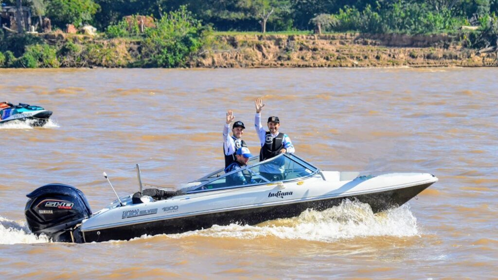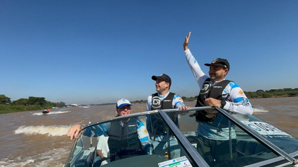El intendente de Goya, Mariano Hormaechea, junto al intendente de Ituzaingó, Juan Pablo Valdés y el viceintendente de dicha localidad, Emilio Nicolás compartieron juntos la increíble largada de embarcaciones y están participando de la edición récord de la Fiesta Nacional del Surubí.