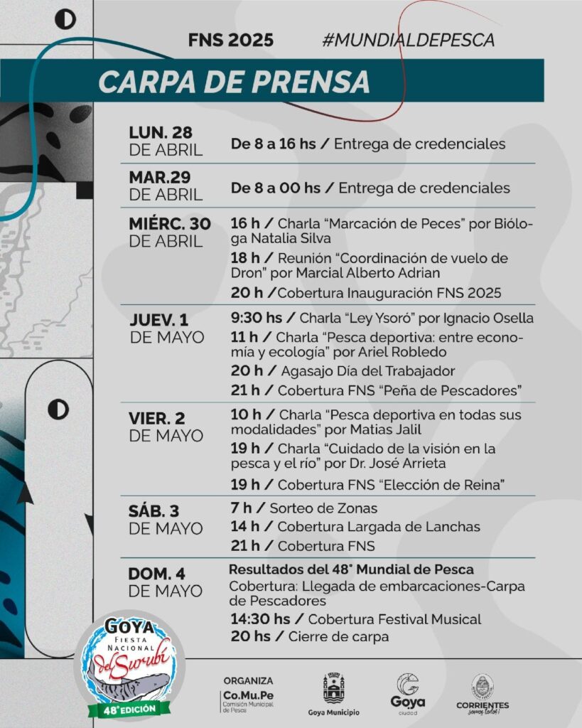 El área encargada de la carpa de prensa informa las principales actividades durante la realización de la 48° Fiesta Nacional del Surubí, entre las que se destaca: