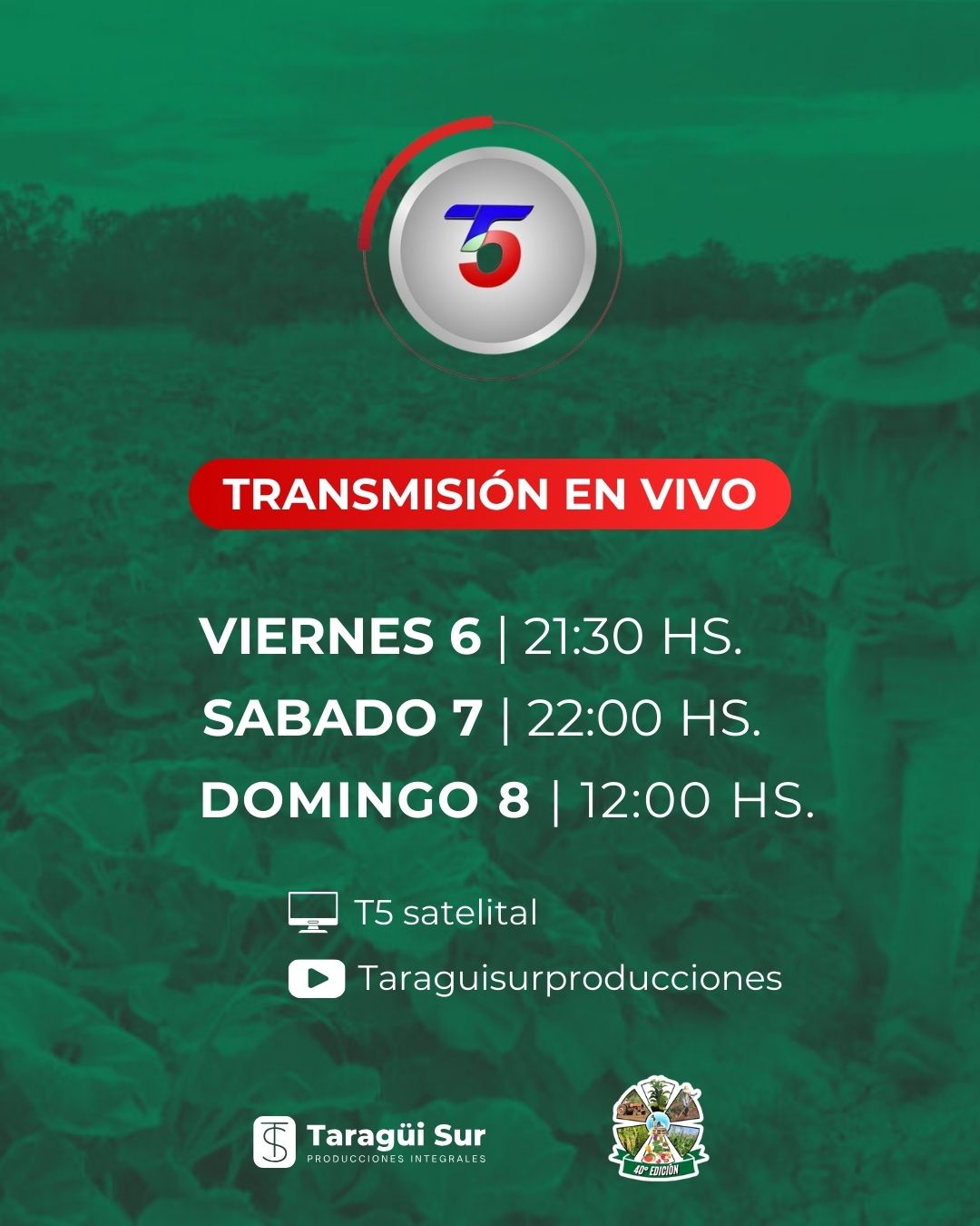 Detrás de la cobertura de la Fiesta Provincial del Agricultor se encuentra un equipo altamente capacitado y comprometido con la calidad de la transmisión. Bajo la conducción de Noel Báez, Alejandro Medina y Gabriel Germán García, con la producción de Sebastián Soler y participación especial de Víctor Hugo Aguirre y María del Carmen, T5 Satelital ha apostado fuerte por mostrar lo mejor de la región.