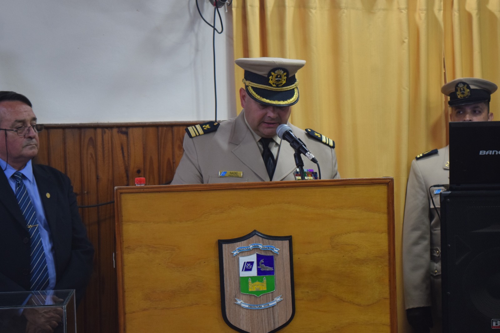 En su alocución, el prefecto Waldir Reinaldo Nacke expresó: “Estamos aquí reunidos para honrar la memoria de todos aquellos hombres que cayeron en las Islas Malvinas y, en particular, para conmemorar la batalla aeronaval desarrollada por nuestros hombres de la Prefectura”.
