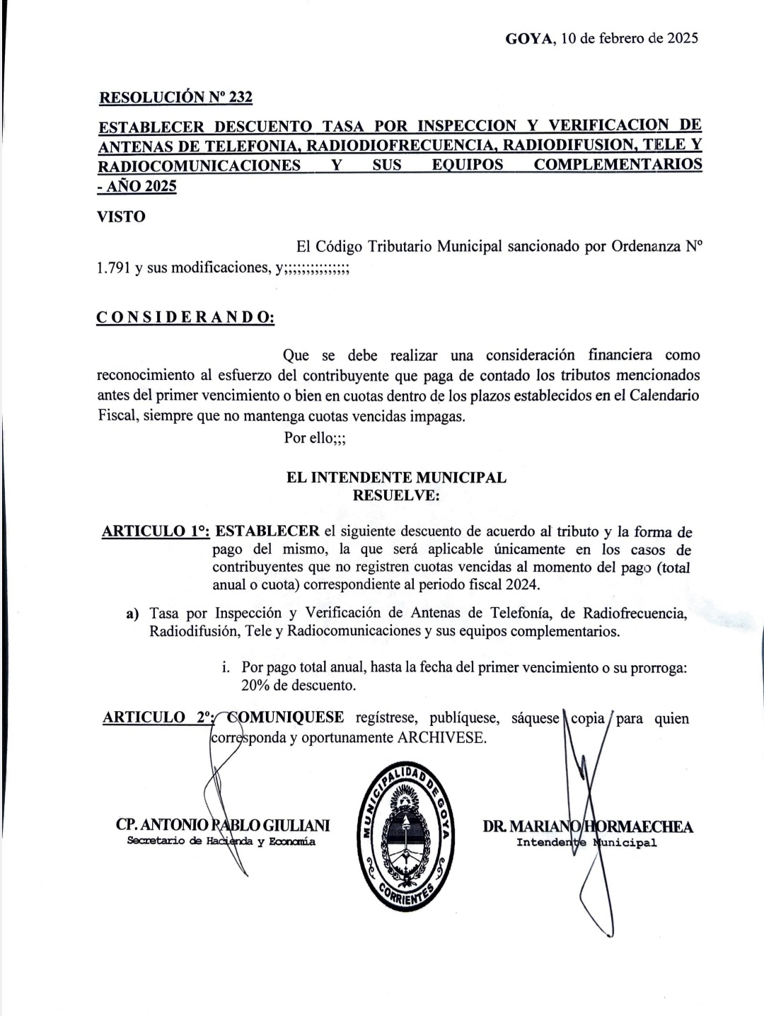 La Municipalidad estableció un descuento del 20% para quienes abonen de contado la tasa de inspección y verificación de antenas de telefonía, radiofrecuencia, radiodifusión y radiocomunicaciones antes del primer vencimiento de 2025. El beneficio se aplica únicamente a contribuyentes sin deudas vencidas.