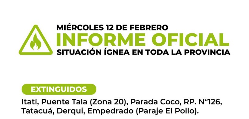 El informe oficial del Gobierno de Corrientes sobre la situación ígnea en la Provincia da cuenta este miércoles que en la jornada se registraron 14 incendios: 7 ya extinguidos y otros 7 todavía activos a las 20 horas. Los extinguidos tuvieron lugar en Itatí, Puente Tala (Zona 20), Parada Coco, Ruta Provincial (RP) N°126, Tatá Cuá, Derqui y Empedrado (Paraje El Pollo).