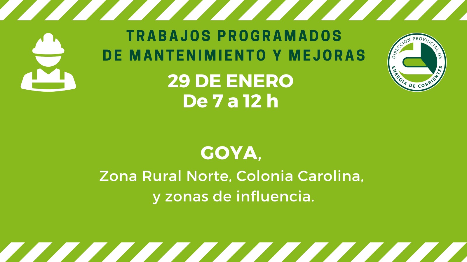 Asimismo en Goya, se ejecutarán tareas de mantenimiento de Líneas de Media Tensión el jueves 29 de 07:00 a 12:00, en Colonia Carolina, y parte Norte de la zona Rural.