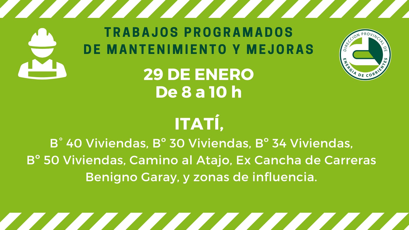 En este contexto, Itatí se ejecutarán tareas de mantenimiento de una Estación de Rebaje, el jueves 29 de 08:00 a 10:00, en los barrios 30 Viviendas, 34 Viviendas, 40 Viviendas, 50 Viviendas, Camino El Atajo, y ex Cancha de Carreras «Benigno Garay”.