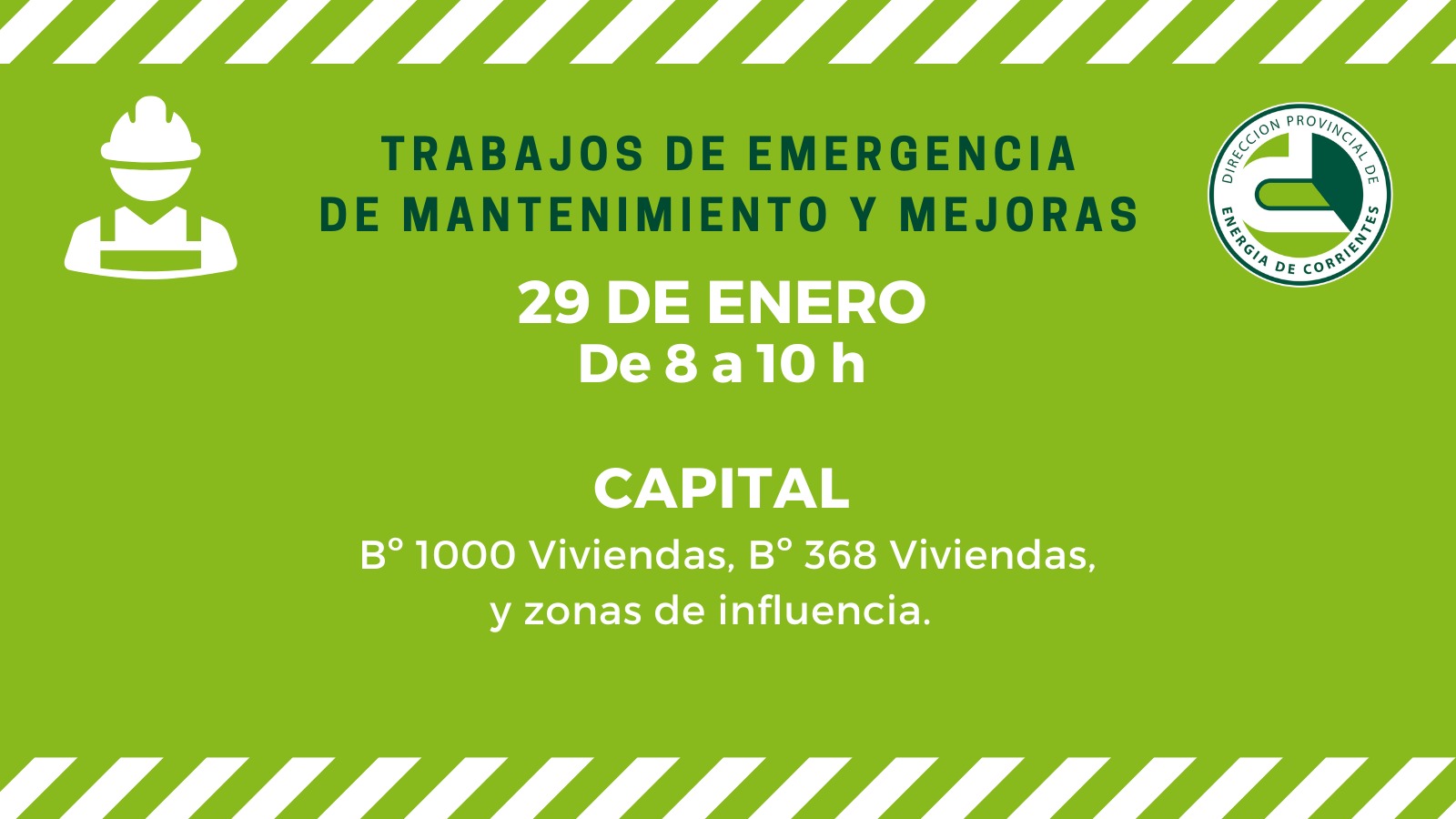 Además en la ciudad Capital, se ejecutarán tareas de mantenimiento de Líneas de Media Tensión, el jueves 29 de 08:00 a 10:00, en los barrios 1000 Viviendas, 368 Viviendas y zonas de influencia.