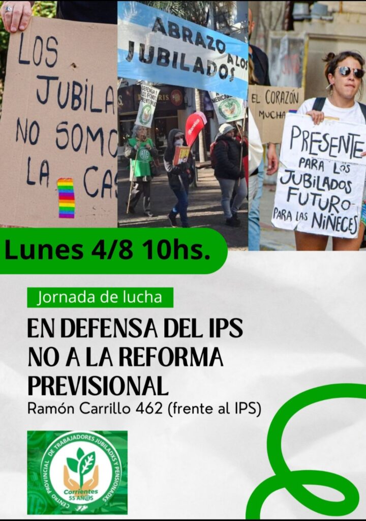 Este lunes a las 10 de la mañana, jubiladas/os y pensionadas/os de Corrientes realizarán una jornada de lucha en defensa del Instituto de Previsión Social (IPS) ante la posibilidad del traspaso de la caja de esta entidad al Estado Nacional. La concentración será frente al edificio del IPS, Ramón Carrillo 462, y estará encabezada por la presidenta del Centro de Jubiladas/os y Pensionadas/os de la Provincia, Leonarda “Pocha” Correa.