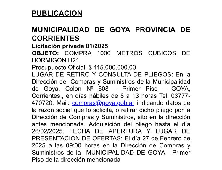LUGAR DE RETIRO Y CONSULTA DE PLIEGOS: En la Dirección de Compras y Suministros de la Municipalidad de Goya, Colon Nº 608 – Primer Piso – GOYA, Corrientes., en días hábiles de 8 a 13 horas Tel. 03777-470720. Mail: compras@goya.gob.ar indicando datos de la razón social que lo solicita, o retirar dicho pliego por la Dirección de Compras y Suministros, sito en la dirección antes mencionada. Adquisición del pliego hasta el día 26/02/2025. FECHA DE APERTURA Y LUGAR DE PRESENTACIÓN DE OFERTAS: El día 27 de Febrero de 2025 a las 09:00 horas en la Dirección de Compras y Suministros de la MUNICIPALIDAD DE GOYA, Primer Piso de la dirección mencionada
