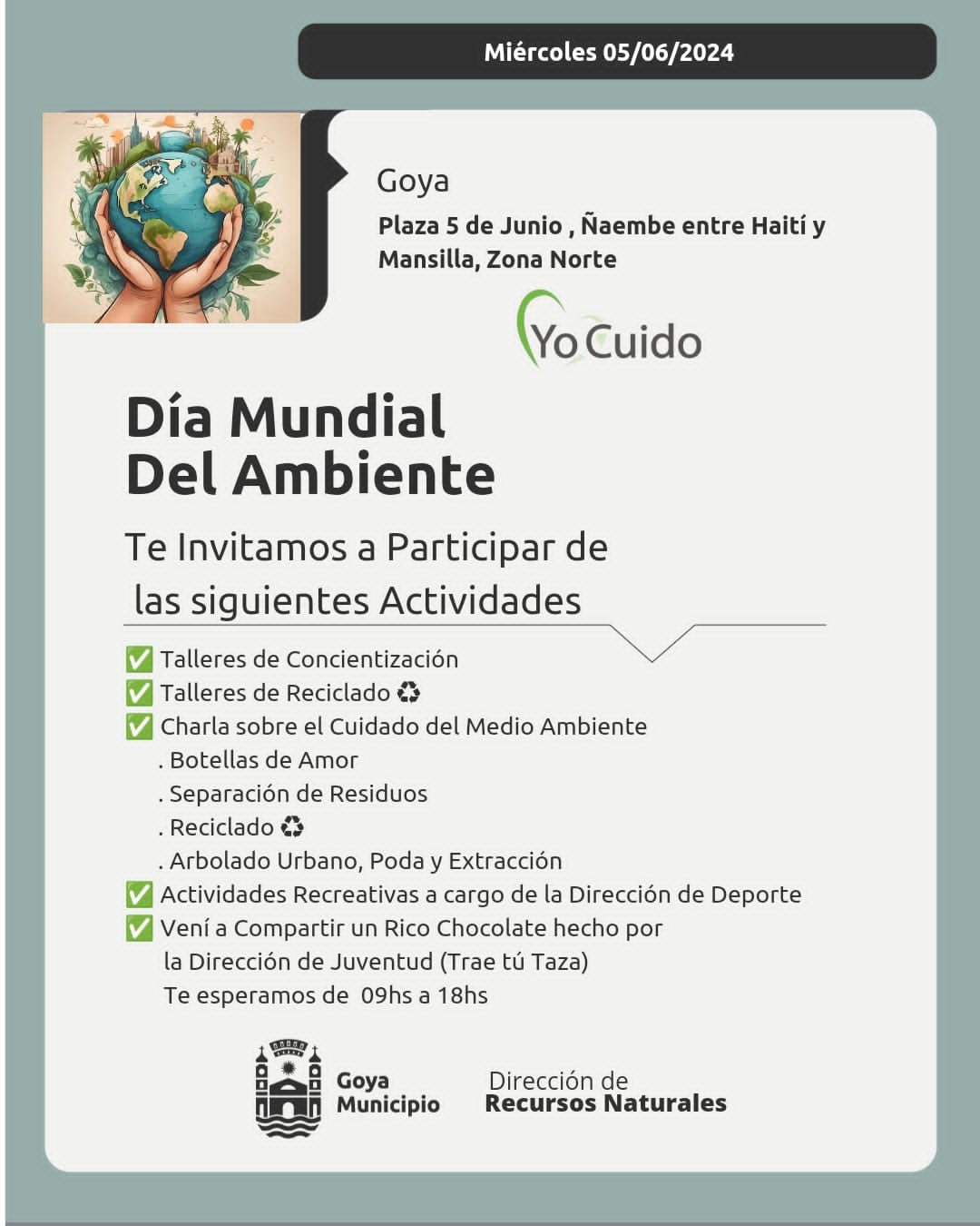 La Municipalidad ha preparado una serie de actividades para recordar el día del Ambiente, el 5 de junio se invita a participar de esta propuesta ambiental. La Dirección de Recursos Naturales de la Municipalidad de Goya ha establecido una serie de actividades a desarrollarse en la Plaza 5 de junio, ubicada en la zona norte de la ciudad, en la calle Ñaembe, entre Haití y Mansilla, desde las 9 a 18 horas.