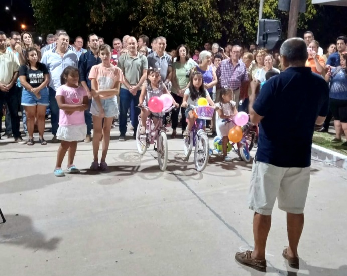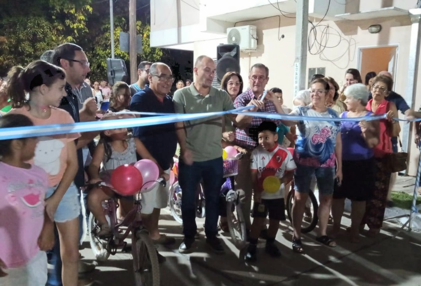 El Intendente Mariano Hormaechea junto al Viceintendente, funcionarios, concejales, los niños que usan este espacio y vecinos procedieron al corte de cintas para dejar oficialmente habilitado los 90 metros de pavimento en hormigón armado en calle Saladas.