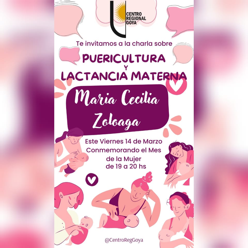 El Centro Regional Goya de la UNNE, en el marco del mes de la mujer, invita a la charla que ofrecerá María Cecilia Zoloaga sobre Puericultura y Lactancia Materna.