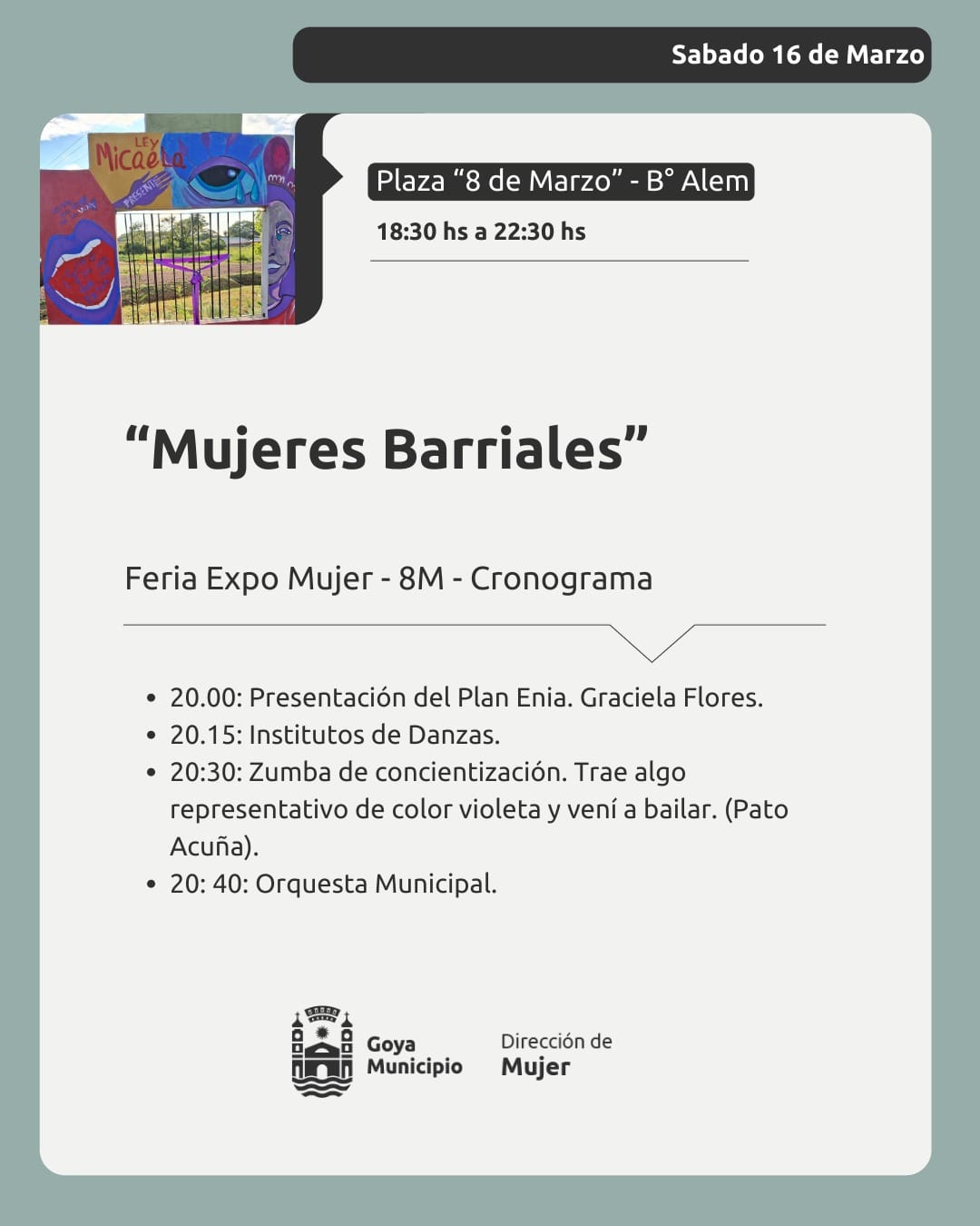 “El formato será similar al desplegado en plaza Mitre el pasado 8 de marzo. Se harán conversatorios referidos a varias temáticas, como el consumo problemático entre las mujeres, la necesidad del cuidado del medio ambiente, la elaboración del currículum para ingresar al mundo laboral, habrá exposición a cargo de unas 50 mujeres artesanas y emprendedoras, talleres de liderazgo que se vienen cursando en el Club de Emprendedores, y show artístico musical. Se entregarán reconocimientos a mujeres presidentes barriales”, añadió.