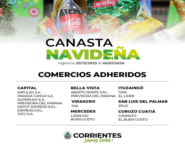 Con los nombres de Canasta Navideña en su 14° edición y Súper Fiestas, la gestión del gobernador Gustavo Valdés presentó las promociones de fin de año, que buscan bajar los precios para que las familias correntinas puedan adquirir los tradicionales productos en las fiestas de Navidad y Año Nuevo. Estas ofertas estarán disponibles desde este miércoles 20 de diciembre al sábado 6 de enero de 2024 inclusive.