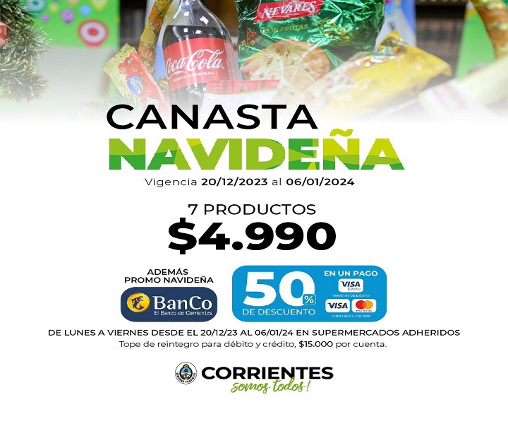 Las promociones, fruto de la articulación del Gobierno de Corrientes con el sector privado y el Banco de Corrientes SA, consisten en una canasta navideña, con siete productos de primeras marcas, a $4.999; adquiriendo con las tarjetas de débito y crédito del Banco de Corrientes SA el precio cae a $2.495.