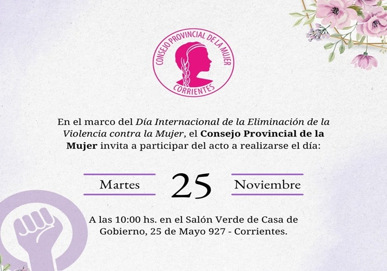 El Gobierno de Corrientes realizará este martes 25 a las 10 de la mañana, un acto en el Salón Verde de la Gobernación, en el marco del Día Internacional de la Eliminación de la Violencia contra la Mujer. La actividad es organizada por el Ministerio de Desarrollo Social, a través del Consejo Provincial de la Mujer.