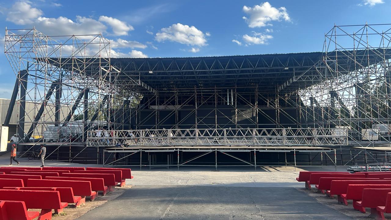 En el sector del escenario, se está llevando a cabo un cambio completo del piso, reemplazándolo por material fenólico de madera, junto con sus tirantes y accesorios correspondientes. Además, toda la estructura del techo ha sido pintada y sometida a un estudio de estabilidad para garantizar su seguridad. Como parte de esta intervención, se instalará un sistema layher para mejorar la sostenibilidad estructural.