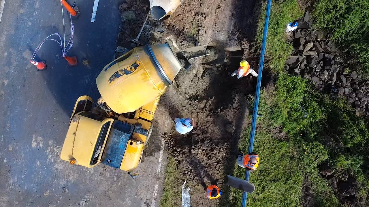 Cardoso indicó que actualmente se encuentra operando una planta móvil de hormigón RDC, con la que se ejecutan las tareas principales de reconstrucción. “Durante la noche se transportaron seis camiones con piedra y arena, además de cemento y agua, para la elaboración de un hormigón H30 y H21, de alta densidad, que permitirá rellenar toda la parte socavada”, precisó.