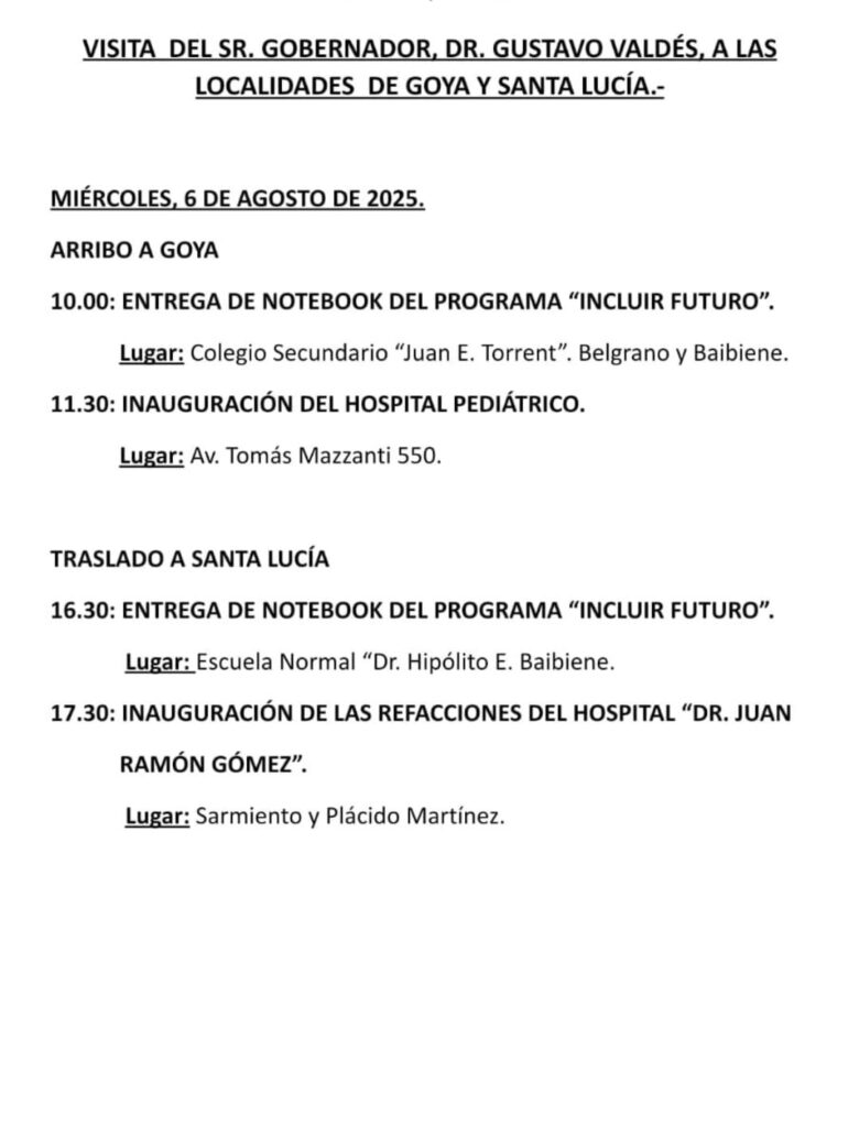 La actividad del Gobernador Gustavo Valdés continuará en horas de la tarde en la localidad de Santa Lucia.