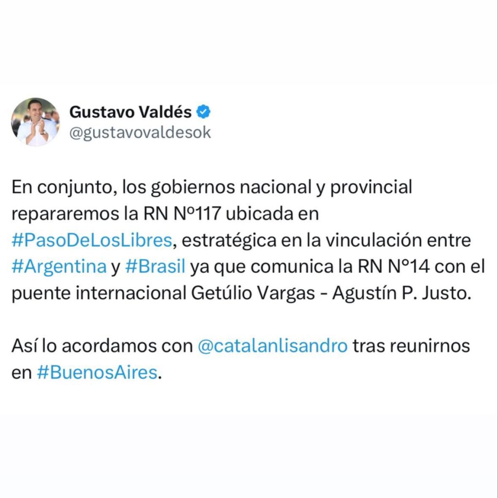 El gobernador Gustavo Valdés informó en su red social este miércoles que “en conjunto, los gobiernos nacional y provincial repararemos la RN Nº117 ubicada en Paso de los Libres, estratégica en la vinculación entre Argentina y Brasil ya que comunica la RN N°14 con el puente internacional Getúlio Vargas – Agustín P. Justo” y reveló que “así lo acordamos con Lisandro Catalán tras reunirnos en Buenos Aires”.