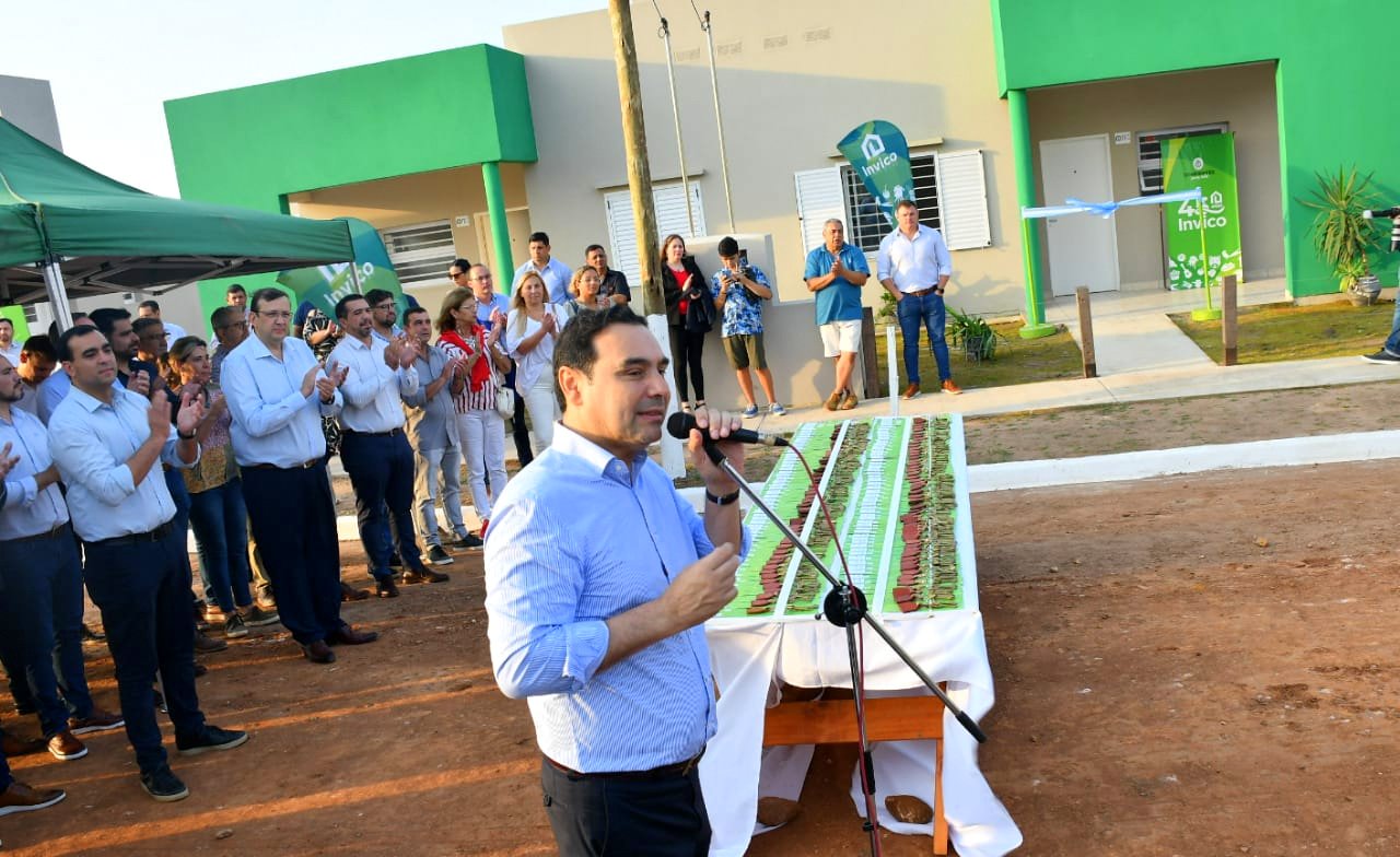 Al iniciar su discurso, el gobernador informó que estas casas se realizaron mediante el Fondo Nacional de la Vivienda, aclarando que este último aportó el 40% del financiamiento y el 60% restante estuvo a cargo de la Provincia. “De otra forma no se hubieran terminado estas viviendas para resolver las necesidades de estas 100 familias”, declaró.
